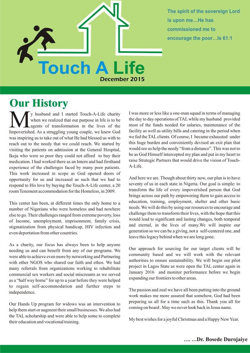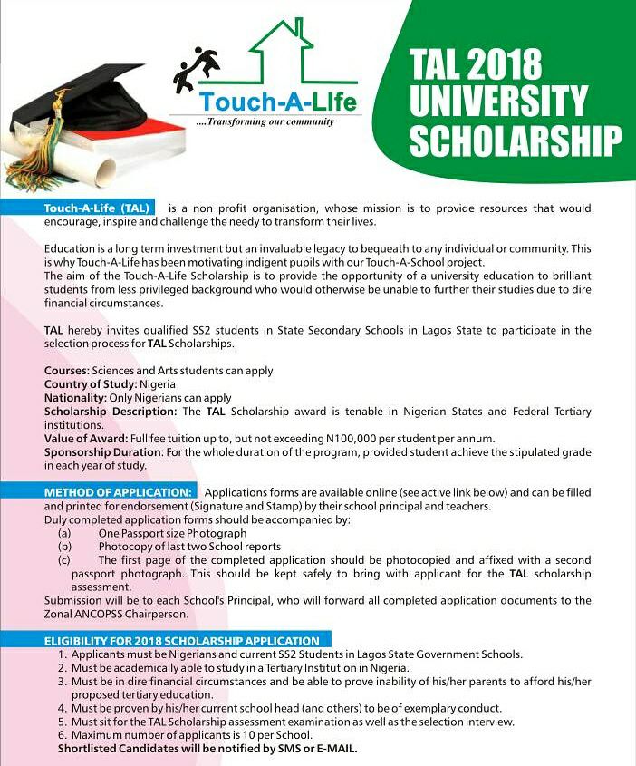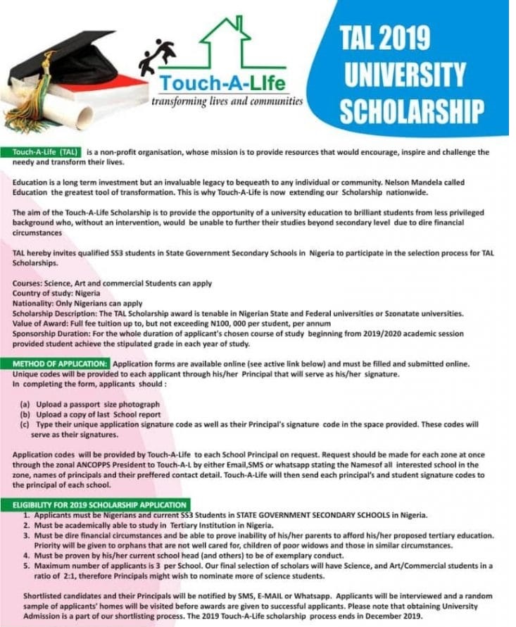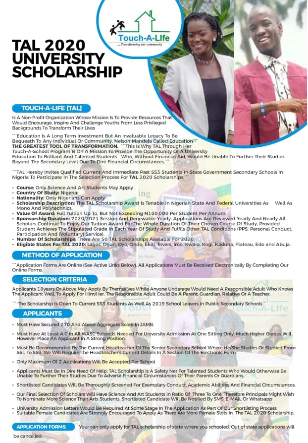 Touch-A-Life (TAL) is a charity dedicated to providing scholarships to high-achieving students from disadvantaged backgrounds. In addition to financial grants, TAL Scholars receive personalised support and mentoring throughout university.We select Scholars annually through a competitive application process, granting an average of N500,000:00 in 'scholarships to each beneficiary.